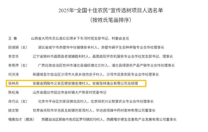 近日,農(nóng)業(yè)農(nóng)村部辦公廳正式公布2025年“全國十佳農(nóng)民”宣傳選樹項(xiàng)目人選名單,安徽張林漁業(yè)有限公司總經(jīng)理張林兵榜上有名,成為我省唯一獲此殊榮的人。
