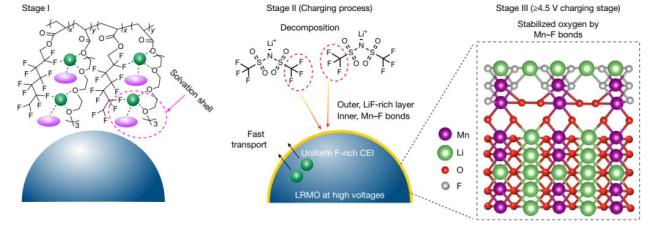 團隊在聚醚電解質(zhì)中引入強吸電子含氟基團,顯著提升了其耐高壓性能,使其可匹配4.7 V高電壓富鋰錳基正極,實現(xiàn)了單一電解質(zhì)對高電壓正極與金屬鋰負極的同步兼容?;阡囨I化學(xué)原理,團隊構(gòu)建了“–F???Li????O–”配位結(jié)構(gòu),誘導(dǎo)形成具有高離子電導(dǎo)率的富陰離子溶劑化結(jié)構(gòu),在電極表面衍生出富含氟化物的穩(wěn)定界面層,顯著提升了界面穩(wěn)定性。