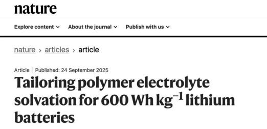 研究成果以“調(diào)控聚合物電解質(zhì)溶劑化結(jié)構(gòu) 實現(xiàn)600 Wh kg?1鋰電池”為題,于9月24日在線發(fā)表于《自然》(Nature)。該研究為開發(fā)實用化的高安全性、高能量密度固態(tài)鋰電池提供了新思路與技術(shù)支撐。