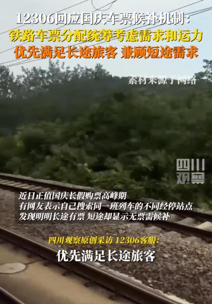 國(guó)慶長(zhǎng)假購(gòu)票高峰期間,有網(wǎng)友反映,搜索同一班列車(chē)不同經(jīng)停站點(diǎn)時(shí),出現(xiàn)長(zhǎng)途顯示有票,短途卻顯示無(wú)票需候補(bǔ)的情況。