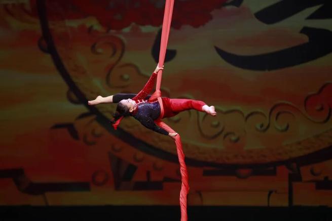 “歌游內(nèi)蒙古”北疆文化活動季第二屆“中國雜技北疆行”精品展演在內(nèi)蒙古藝術(shù)劇院音樂廳舉行,內(nèi)蒙古雜技團演員表演雜技《木蘭歸·立綢》。