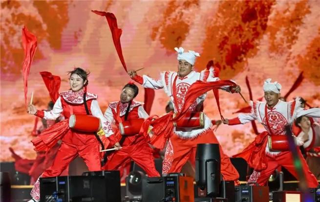“歌游內(nèi)蒙古”北疆文化活動季啟動主題演出中,演員表演《黃河千鼓·綢舞山河》。
