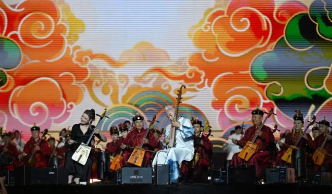 在“歌游內(nèi)蒙古”北疆文化活動季啟動主題演出現(xiàn)場,演員展示民樂合奏《北疆歡歌》。