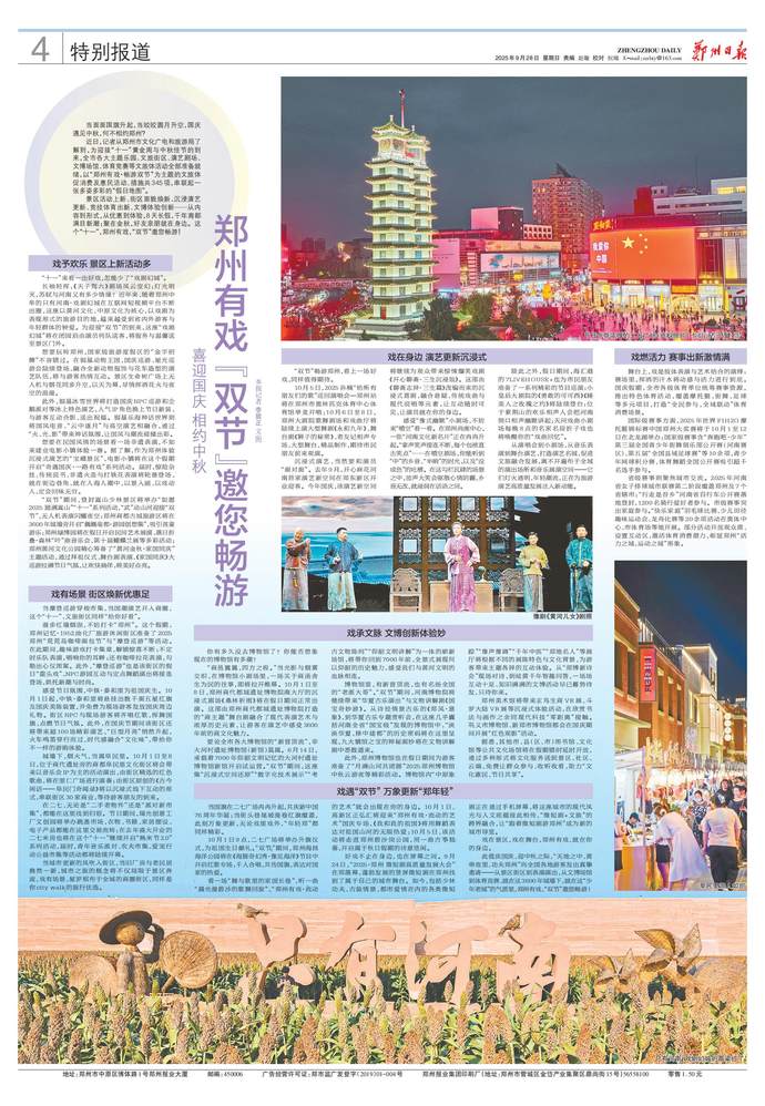 景區(qū)活動精彩紛呈、街區(qū)面貌煥然一新、沉浸演藝不斷更新、競技體育亮點頻出、文博體驗獨具創(chuàng)新……8天長假,千年商都處處洋溢著新潮氣息;金秋時節(jié),親朋好友相伴左右。這個“十一”,鄭州好戲連臺,“雙節(jié)”邀您盡情暢游!