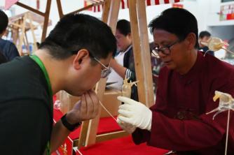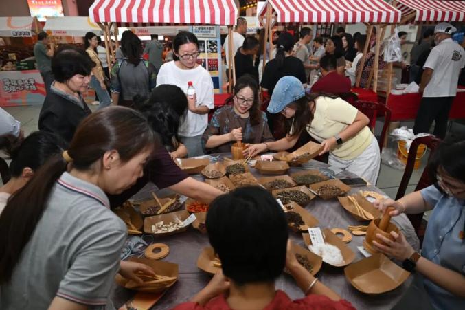手工體驗區(qū)里,可以制作冰皮月餅、香囊和花燈。搗藥杵與藥臼的碰撞聲不斷,王先生正把薄荷與百合碎末裝入香囊袋,他說:“這是給老婆的驚喜,比買的更有心意?!?/p>