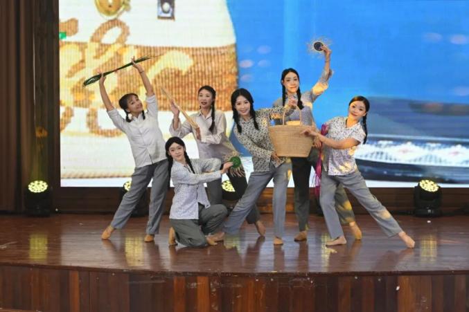 逛累了的職工紛紛坐到文藝演出區(qū),歌曲《萬疆》的悠揚旋律、民樂合奏《上春山》的清雅韻律、相聲《K歌之王》的幽默段子,接連點燃了現(xiàn)場氣氛。當舞蹈《練祁流韻?勞動華章》《鳶舞逐春》登場時,舞臺上靈動的舞姿將徐行草編的精巧、風箏的飄逸融入其中,讓非遺與勞動者風采完美融合,臺下掌聲不斷。