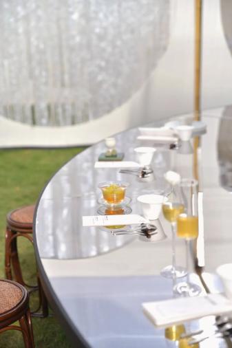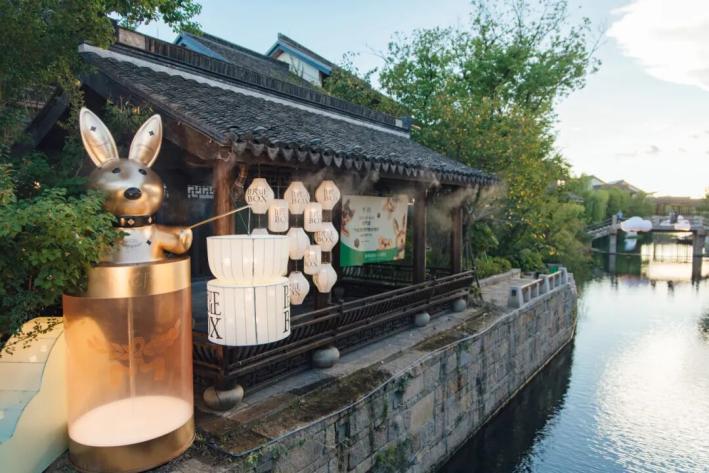 “新焺?dòng)螆@·月滿蟠龍”活動(dòng)以“聽曲、吃席、趕集、切磋、賞燈”為核心,打造了一場(chǎng)為期12天的中秋文化盛宴。活動(dòng)包含近20場(chǎng)“聽曲”演出,開幕當(dāng)天,回聲當(dāng)代樂團(tuán)演繹《蟠龍鳴月夜》,結(jié)合光影技術(shù)重現(xiàn)江南絲竹之美?;顒?dòng)中,吃席環(huán)節(jié)十分有趣,“海月”源于江南園林中“以材映意、虛實(shí)相生”的造園智慧,取海月貝為材,將月之意向融入復(fù)廊、靜水與茶亭之中,構(gòu)建出一處雖不見月,但處處映月的詩(shī)意場(chǎng)景。在“海月茶亭”中特設(shè)圓桌席,依古禮、奉茶酒,呈現(xiàn)融匯器、茶、酒文化的東方美席。午后品茶、入夜飲酒,這既是對(duì)園林觀游美學(xué)的當(dāng)代轉(zhuǎn)譯,也是一場(chǎng)中西融合的生活美學(xué)實(shí)踐。