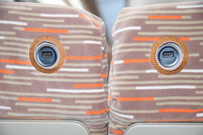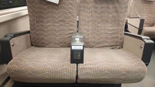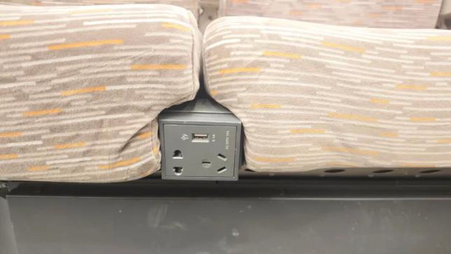 二等座的充電插座位于相鄰座墊之間,同樣是帶USB插口的五孔插座。