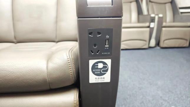 一等座的充電插座位于座椅中間扶手下方,是帶USB插口的五孔插座。