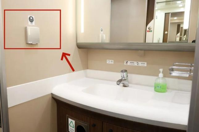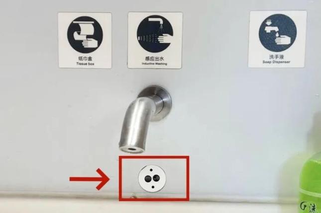 高鐵洗手臺的感應(yīng)器在水龍頭下方,看到黑色感應(yīng)區(qū)后,伸出手對準它,水就會流出來。