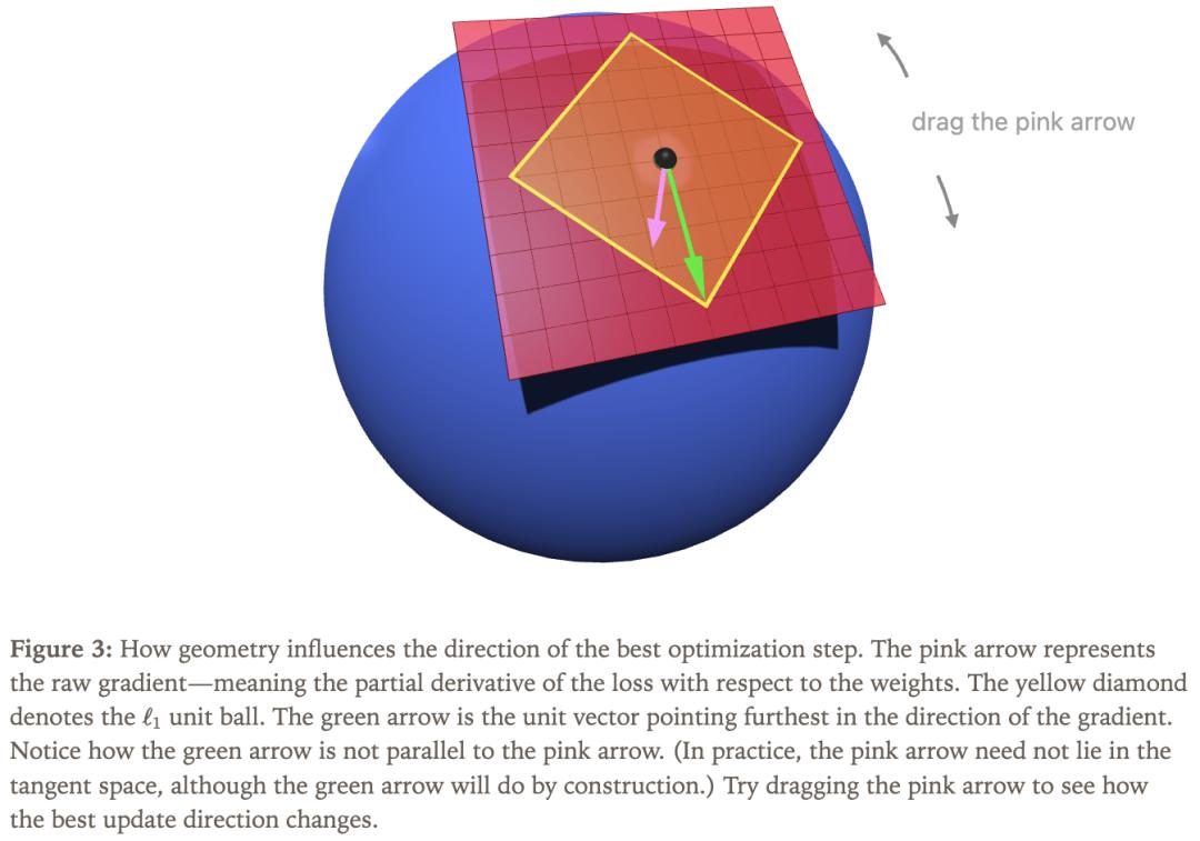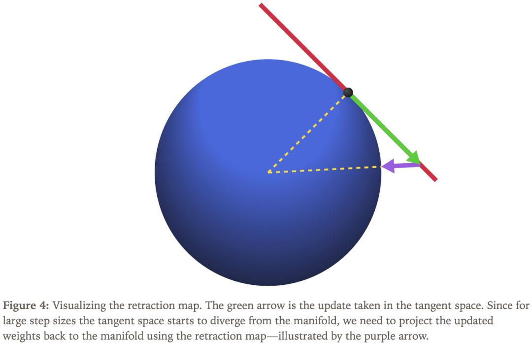 圖3中,粉色箭頭表示原始梯度,即損失函數(shù)對權(quán)重的偏導(dǎo)數(shù)。這意味著我們不一定嚴格按照梯度方向移動。為了用數(shù)學(xué)表達這個過程,可將「在流形約束和特定距離度量下的最優(yōu)更新方向」看作帶約束的優(yōu)化問題,以搭配歐幾里得范數(shù)的超球面為例。