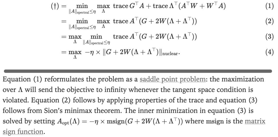 要為Stiefel流形設(shè)計優(yōu)化器,還需選擇合適的距離函數(shù)。為限制權(quán)重更新對輸入向量的最大拉伸作用,譜范數(shù)是合適的選項。雖然它只約束了最大效應(yīng),但由于優(yōu)化器會飽和這一上限,也能間接防止最小效應(yīng)過小。這一想法促成了Muon優(yōu)化器的提出。