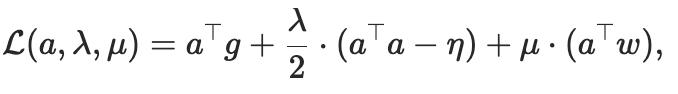 其中λ和μ是拉格朗日乘子。對拉格朗日函數(shù)對a求導(dǎo)并令其為零,結(jié)合兩個約束條件求解λ和μ,可得到最優(yōu)更新方向。