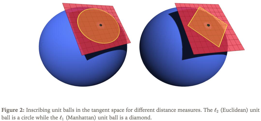 要在流形上設(shè)計訓(xùn)練算法,需先明確在切空間里如何度量「距離」。一個解決思路是直接在切空間中進行優(yōu)化,讓每一步沿著流形「表面」走,使學(xué)習(xí)率更好地對應(yīng)「實際位移」。常見選擇是歐幾里得距離,也可采用其他方式測量距離,如圖2所示。