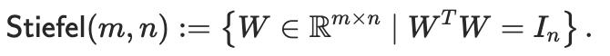 我們希望矩陣的「拉伸效應(yīng)」接近于1,因此選擇所有奇異值均為1的矩陣流形。這種矩陣流形在數(shù)學(xué)上被稱為Stiefel流形,在高矩陣( m≥n)的假設(shè)下,它可以等價地定義為以下集合: