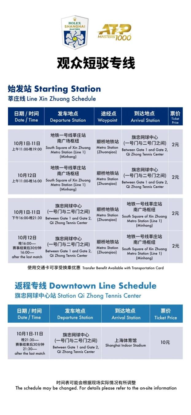 賽事方提供地鐵一號線莘莊站南廣場樞紐 - 顓橋地鐵站 - 旗忠網(wǎng)球中心的往返觀眾短駁專線。還有從旗忠網(wǎng)球中心至上海體育館的返程專線,保障大家安全返程。
