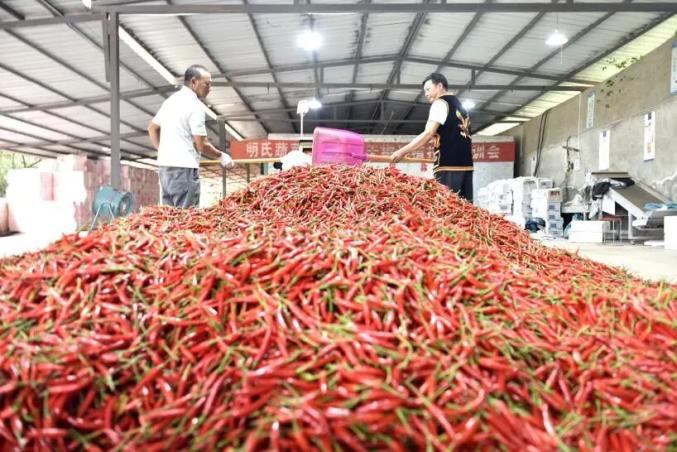 當(dāng)?shù)厝罕娬χ烧?、分揀、裝運(yùn)成熟的朝天椒,并及時(shí)銷往廣州、重慶等外地市場。田間地頭一派繁忙,大家在收獲中喜迎豐年。