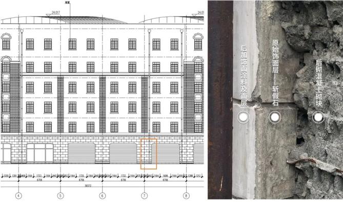 基座整體出現空鼓、開裂、污染嚴重的情況。通過全面清理檢查原墻面,發(fā)現部分區(qū)域保留有原斬假石飾面,但現狀是面磚表面被涂刷白色涂料或水泥砂漿覆蓋,部分區(qū)域缺失原斬假石飾面。同時,現狀斬假石面層上遺留有大量的店招鐵件,產生了很多裂痕和污損,這部分斬假石將全部拆除,并按原樣式進行復原。