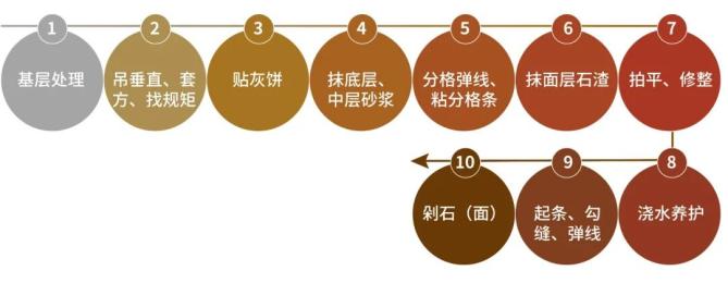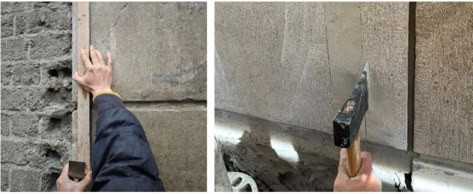 對保留有原斬假石的飾面區(qū)域進行表面涂料或水泥砂漿的脫除、清潔和修繕,對沒有原斬假石飾面層的區(qū)域則進行原樣新做恢復,最大程度地復原建筑基座的斬假石風貌。