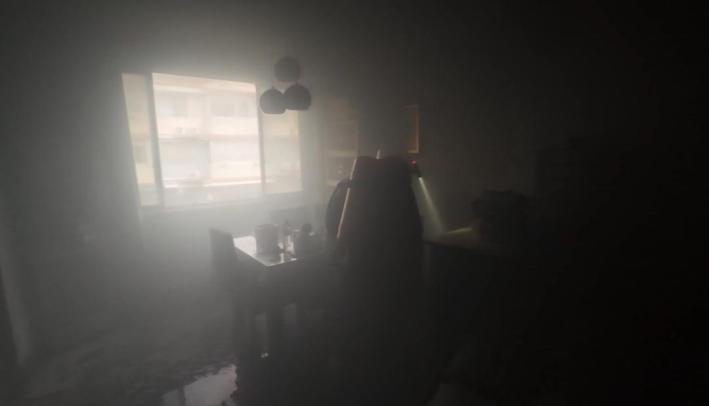 現(xiàn)場煙霧彌漫,一臺飲水機及其周邊的沙發(fā)、餐桌等物品不同程度燒損。