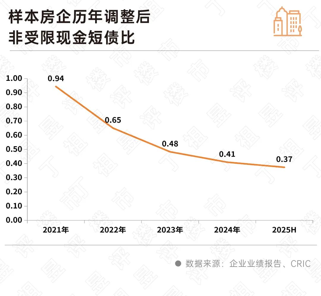 值得注意的是,房企短期償債壓力仍在加大。2025年中期樣本房企的調(diào)整后非受限現(xiàn)金短債比的加權(quán)平均值相較于期初繼續(xù)下降了0.04至0.37。實(shí)際上企業(yè)的流動(dòng)性風(fēng)險(xiǎn)更大,因?yàn)椴糠制髽I(yè)中報(bào)未披露預(yù)售監(jiān)管資金,加上該部分受監(jiān)管資金后,企業(yè)持有的非受限現(xiàn)金將進(jìn)一步減少。