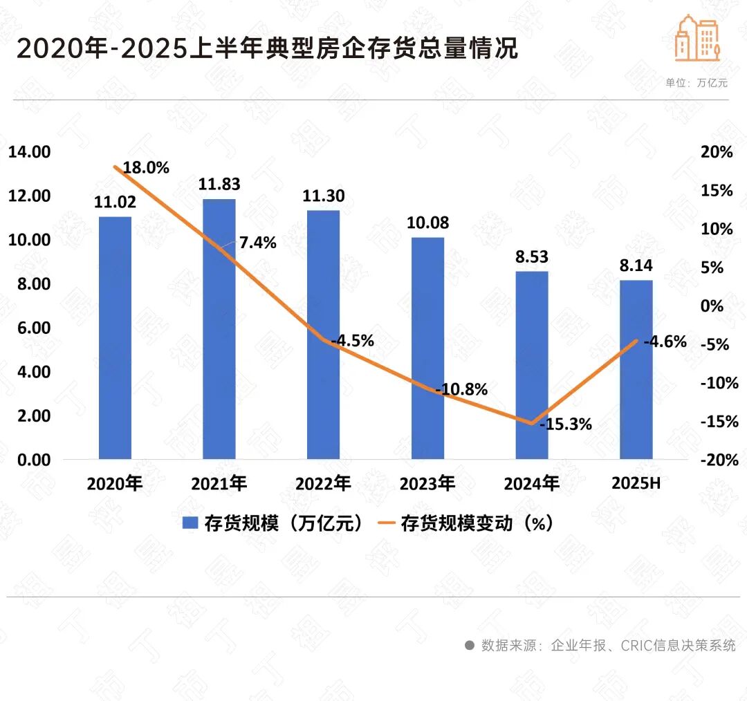 從典型企業(yè)2025上半年數(shù)據(jù)來(lái)看,存貨賬面價(jià)值總計(jì)8.14萬(wàn)億元,較2024年末的8.53萬(wàn)億元下降4.6%。存貨規(guī)模自2022年以來(lái)連續(xù)多年負(fù)增長(zhǎng),今年已是第四年。從半年下降幅度看,對(duì)比2024上半年較期初下降5.1%的降幅,存貨總量規(guī)模下降節(jié)奏略有減緩。
