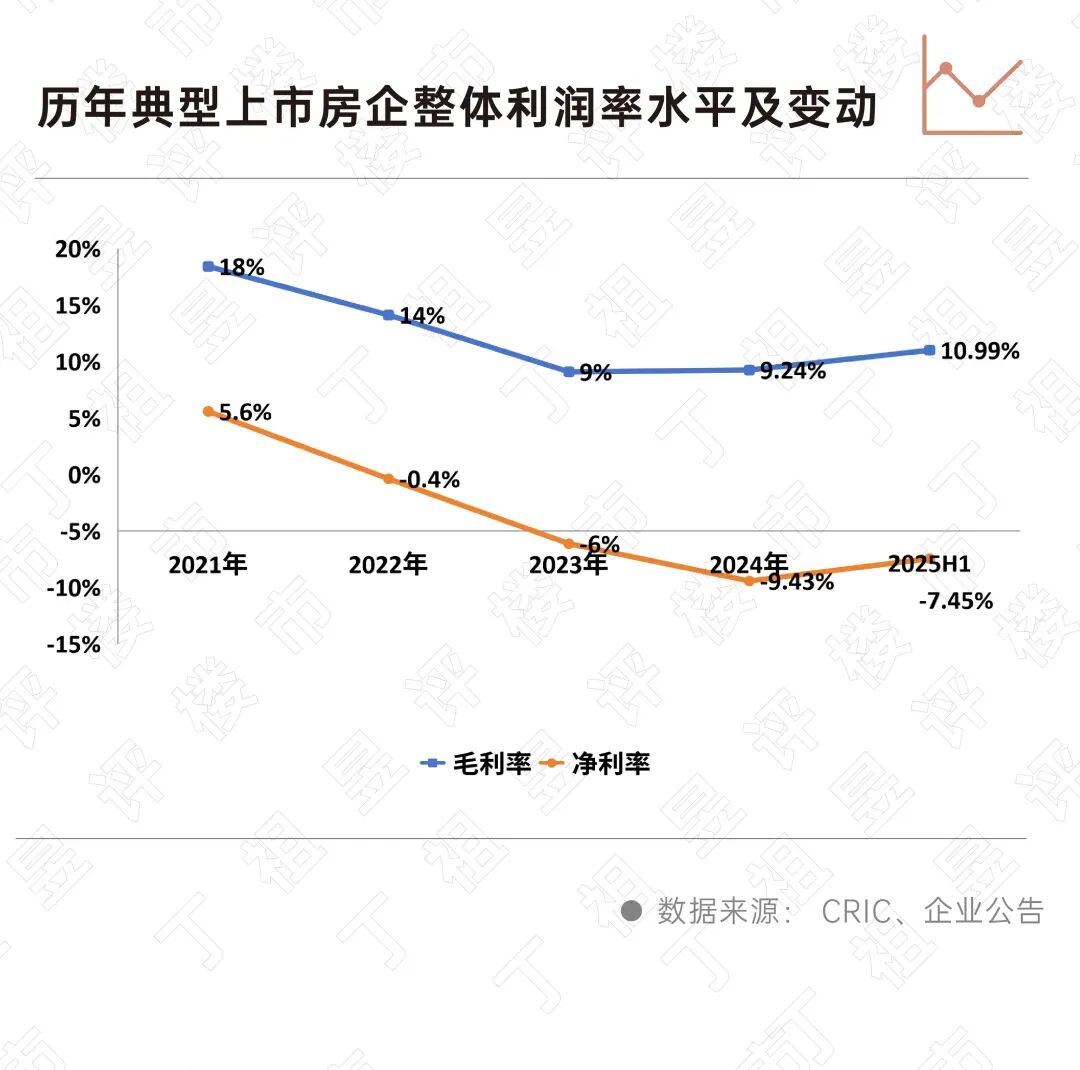 2025年上半年行業(yè)典型上市房企整體毛利率為10.87%,較2024全年上升1.8個(gè)百分點(diǎn);凈利率為 -7.45%,處于虧損狀態(tài);歸母凈利率同樣為 -7.9%。若排除已出險(xiǎn)企業(yè),僅看27家未暴雷房企,其毛利率為15.09%,較2024全年上升2個(gè)百分點(diǎn);凈利率為1.71%,扭轉(zhuǎn)了2024年凈利虧損態(tài)勢(shì)。