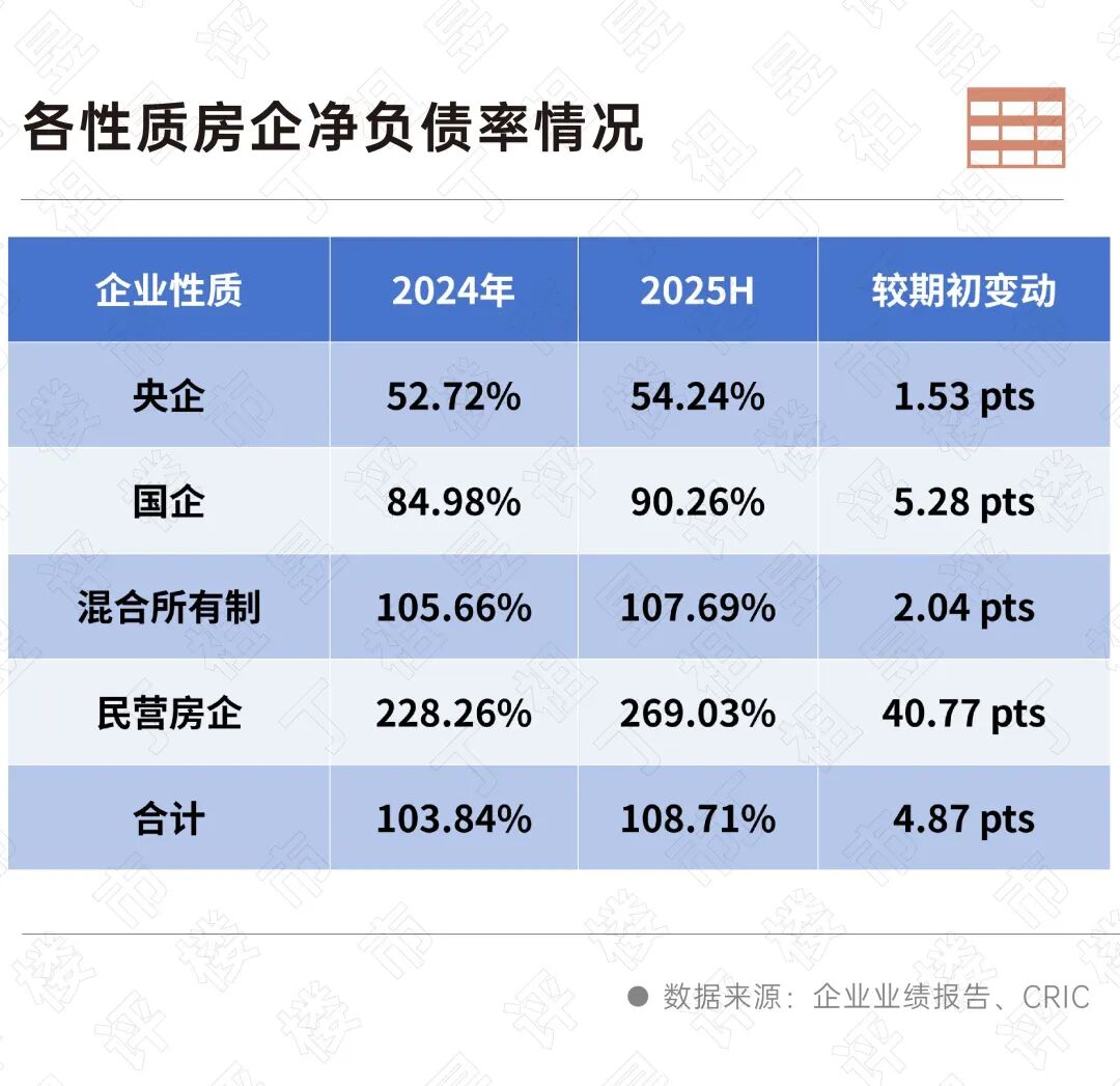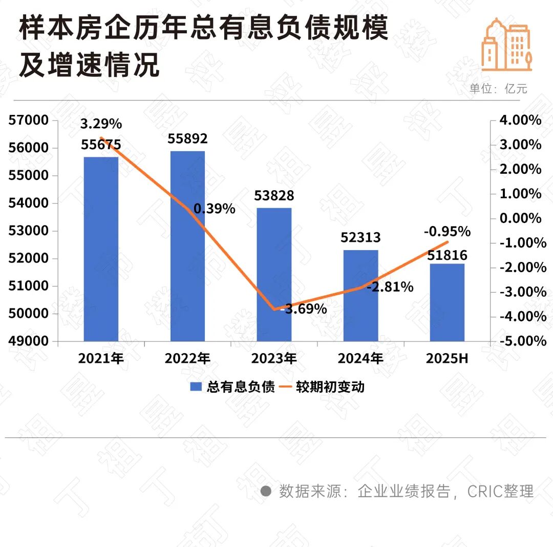 2025年中期,樣本房企的總有息債規(guī)模為51816億元,較期初繼續(xù)減少了0.95%,大部分企業(yè)加快去杠桿進(jìn)程。其中,央企的總有息負(fù)債和期初幾乎持平,國(guó)企增長(zhǎng)了1.8%,混合所有制和民營(yíng)房企則分別較期初減少了3.23%和1.58%,榮安地產(chǎn)和遠(yuǎn)洋集團(tuán)均減少了30%以上。