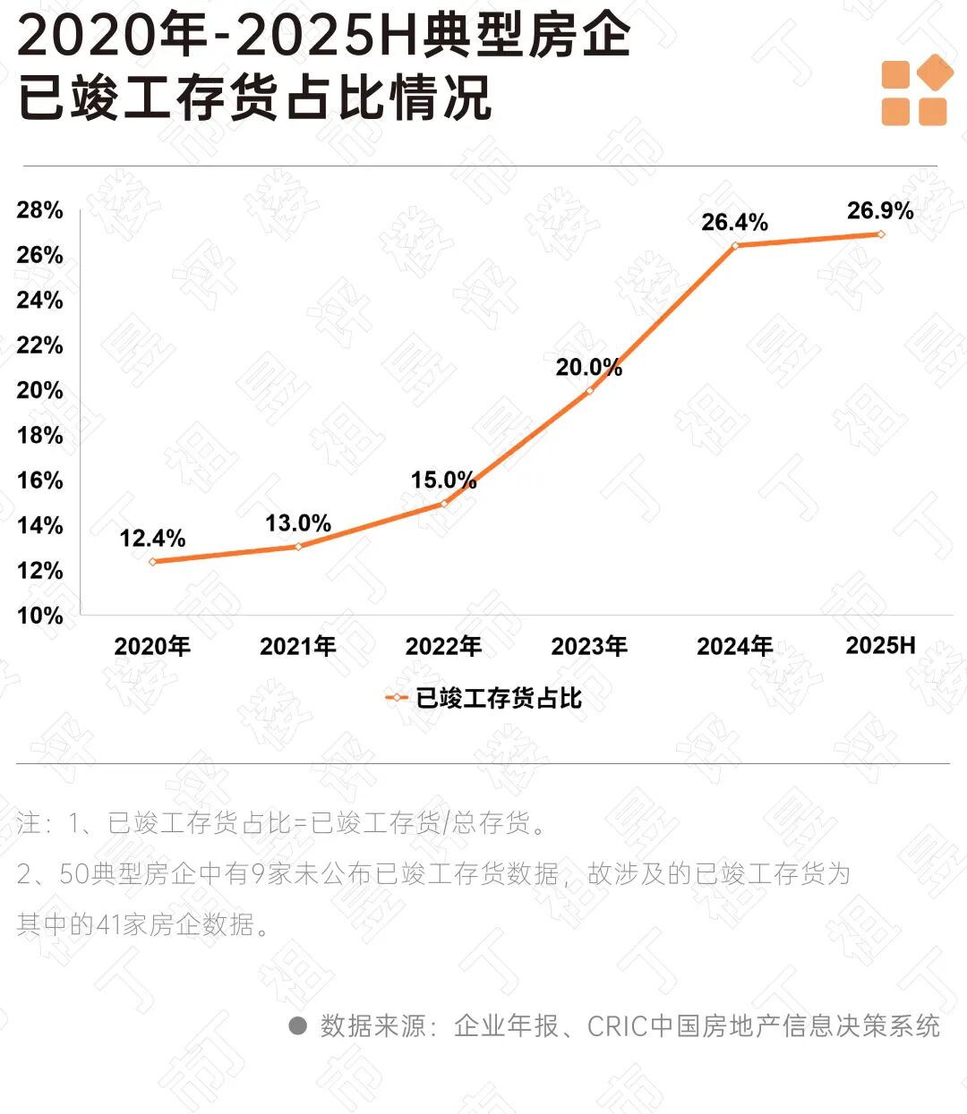 從存貨結(jié)構(gòu)看,2025上半年樣本房企已竣工存貨占比達(dá)到26.9%,較年初繼續(xù)提升0.5個(gè)百分點(diǎn),達(dá)到近五年來(lái)的最高值。近年來(lái)現(xiàn)房占比不斷提升,但從當(dāng)前半年報(bào)來(lái)看有改善跡象,當(dāng)期現(xiàn)房占比增幅下降,當(dāng)期期末現(xiàn)房占比僅較期初上漲0.5個(gè)百分點(diǎn),低于去年同期漲幅1.2個(gè)百分點(diǎn)??紤]到房企項(xiàng)目竣工節(jié)點(diǎn)多在下半年,現(xiàn)房去化壓力依然存在。