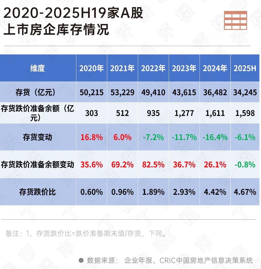 50家典型房企中19家A股房企計(jì)提的存貨跌價(jià)準(zhǔn)備余額在2021 - 2022年攀升速度最快,分別同比提升69.2%、82.5%,2023年以來(lái)增速有所放緩,2025上半年末存貨跌價(jià)準(zhǔn)備余額1598億元,較年初下降0.8%。但歷年數(shù)據(jù)顯示,半年度存貨跌價(jià)準(zhǔn)備余額絕對(duì)值的下降并不意味著存貨計(jì)提減值結(jié)束,而是與企業(yè)開(kāi)竣工節(jié)奏有關(guān)。