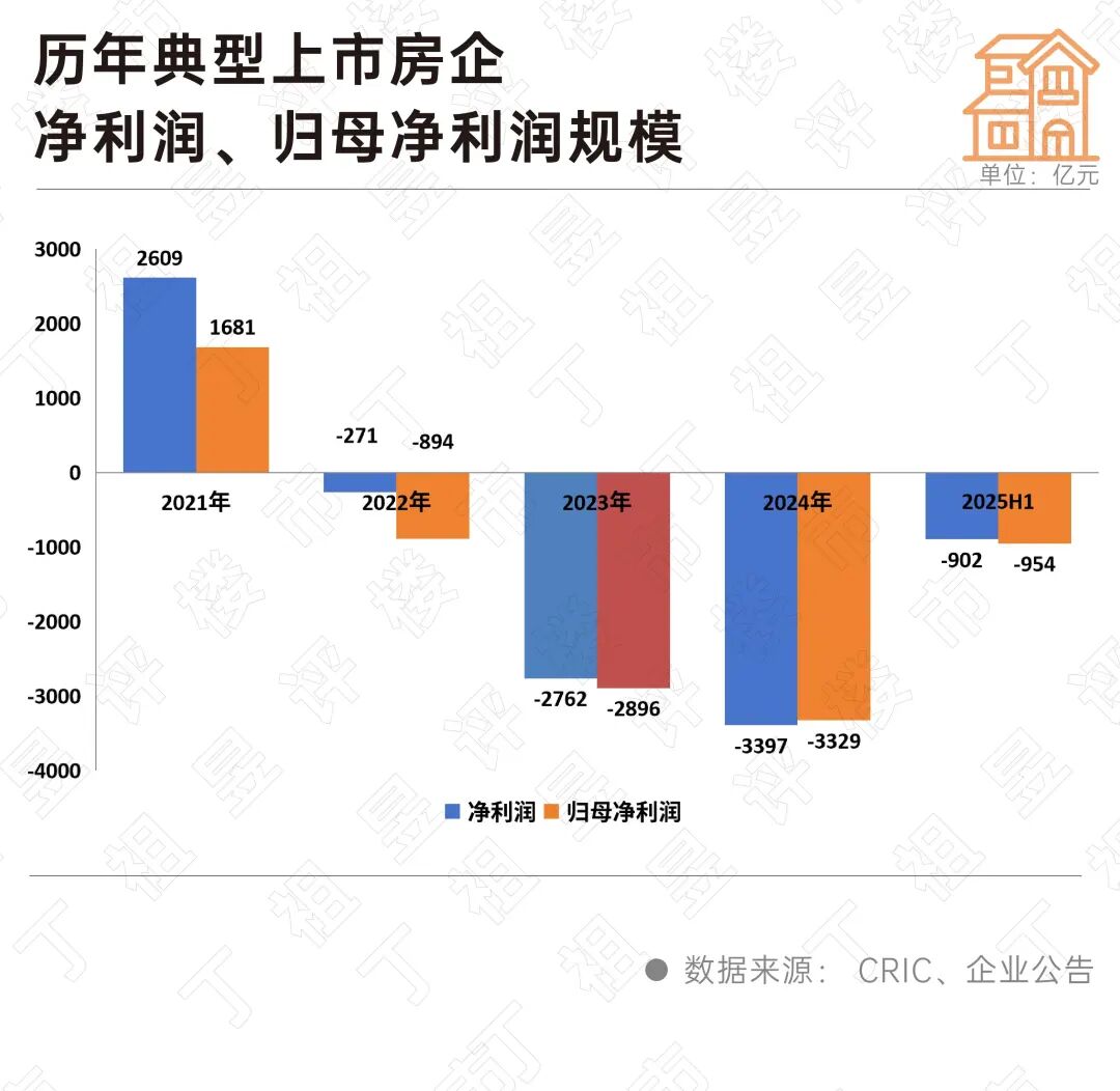 整體行業(yè)盈利表現(xiàn)不佳。2025年上半年50家房企凈利潤(rùn)虧損達(dá)902億,歸母凈利潤(rùn)虧損954億。自2022年上市房企凈利潤(rùn)首次大幅虧損后,2023年虧損擴(kuò)大至2762億,2024年進(jìn)一步擴(kuò)大至3397億,至2025年上半年,行業(yè)凈利潤(rùn)已連續(xù)四年虧損。