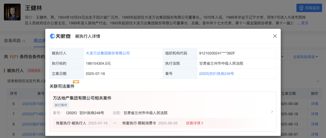 據(jù)天眼查消息,大連萬達集團股份有限公司及其法定代表人王健林等被限制高消費。相關(guān)案件執(zhí)行標的為1.86億元,執(zhí)行法院是甘肅省蘭州市中級人民法院。
