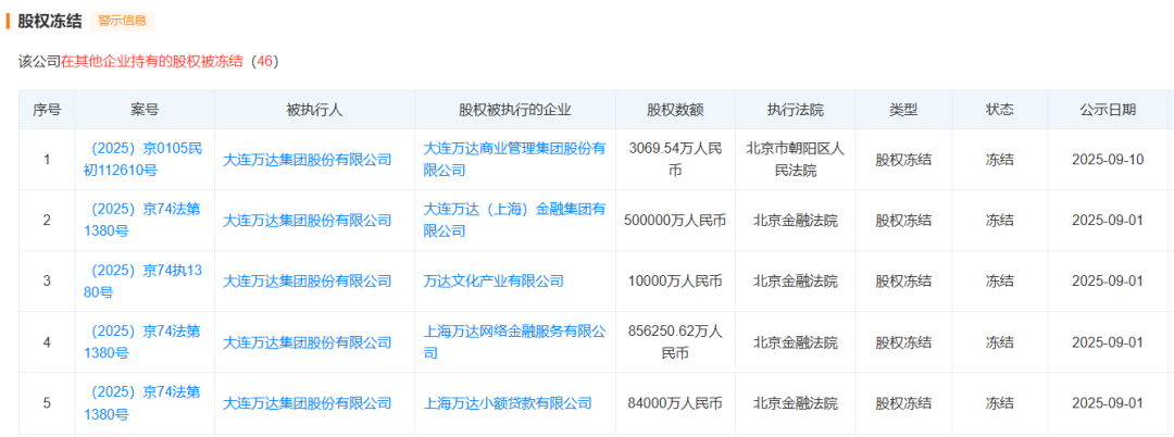 此外,大連萬達集團股份有限公司在其他企業(yè)持有的股權(quán)被凍結(jié),相關(guān)股權(quán)凍結(jié)案件達40余則。9月1日,新增4則股權(quán)凍結(jié)信息,股權(quán)所在企業(yè)分別為大連萬達(上海)金融集團有限公司、萬達文化產(chǎn)業(yè)有限公司、上海萬達網(wǎng)絡(luò)金融服務(wù)有限公司、上海萬達小額貸款有限公司,凍結(jié)股權(quán)數(shù)額合計超145億元,執(zhí)行法院均為北京金融法院。