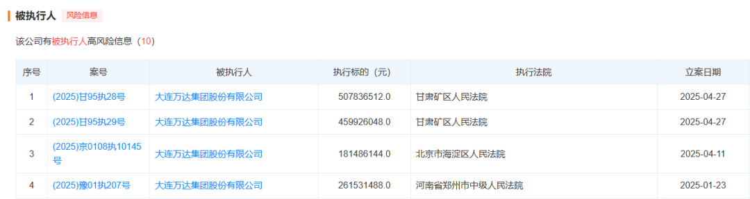 天眼查數(shù)據(jù)表明,今年以來,大連萬達集團股份有限公司新增多則被執(zhí)行人信息。今年1月,新增執(zhí)行標的2.62億元,執(zhí)行法院為河南省鄭州市中級人民法院;4月,新增三則被執(zhí)行人信息,合計執(zhí)行標的為11.49億元,執(zhí)行法院分別為甘肅礦區(qū)人民法院、北京市海淀區(qū)人民法院。風險信息顯示,該公司現(xiàn)存11條被執(zhí)行人信息,被執(zhí)行總金額超52億元。