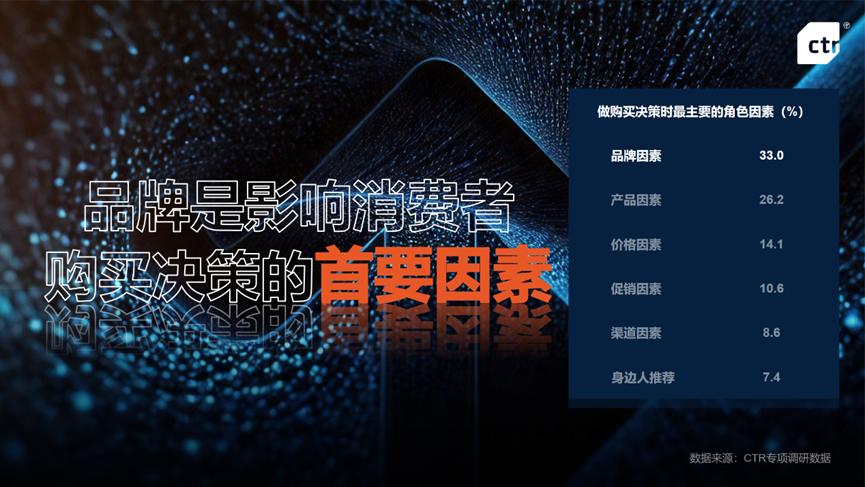 CTR此前的調(diào)研結果顯示,品牌是影響消費者購買決策的首要因素,占比達33%,明顯高于產(chǎn)品、價格、促銷等其他指標。如今,越來越多的廣告主深刻認識到,品牌建設是積累長期戰(zhàn)略資產(chǎn)的核心,能與消費者建立穩(wěn)固的心智連接,奠定關鍵的品牌信任基礎。這種信任不僅能有效抵御市場波動和不確定性,還能讓內(nèi)容種草和銷售轉(zhuǎn)化等后續(xù)環(huán)節(jié)事半功倍。