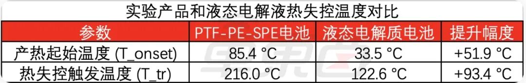 ▲實驗產(chǎn)品和液態(tài)電解液熱失控溫度對比(數(shù)據(jù)來源:清華大學(xué))