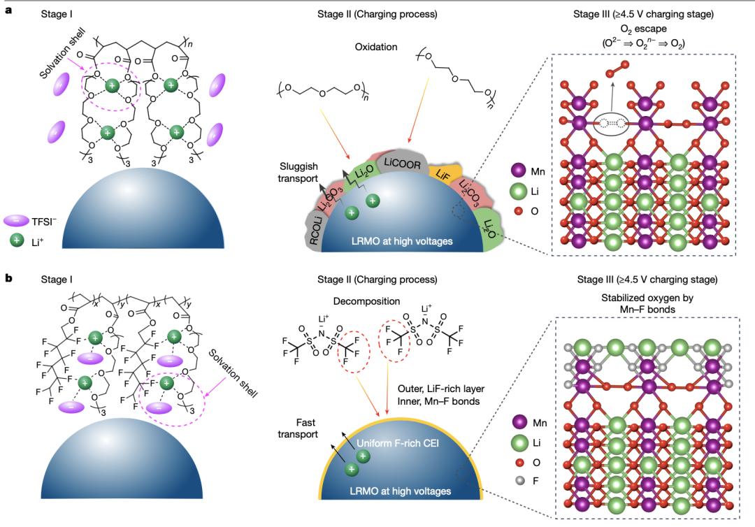 研究人員通過精密調(diào)控鋰離子周圍的“溶劑化結(jié)構(gòu)”,成功解決了長期困擾高容量富鋰錳基氧化物(LRMO)正極的關(guān)鍵性界面不穩(wěn)定性問題。