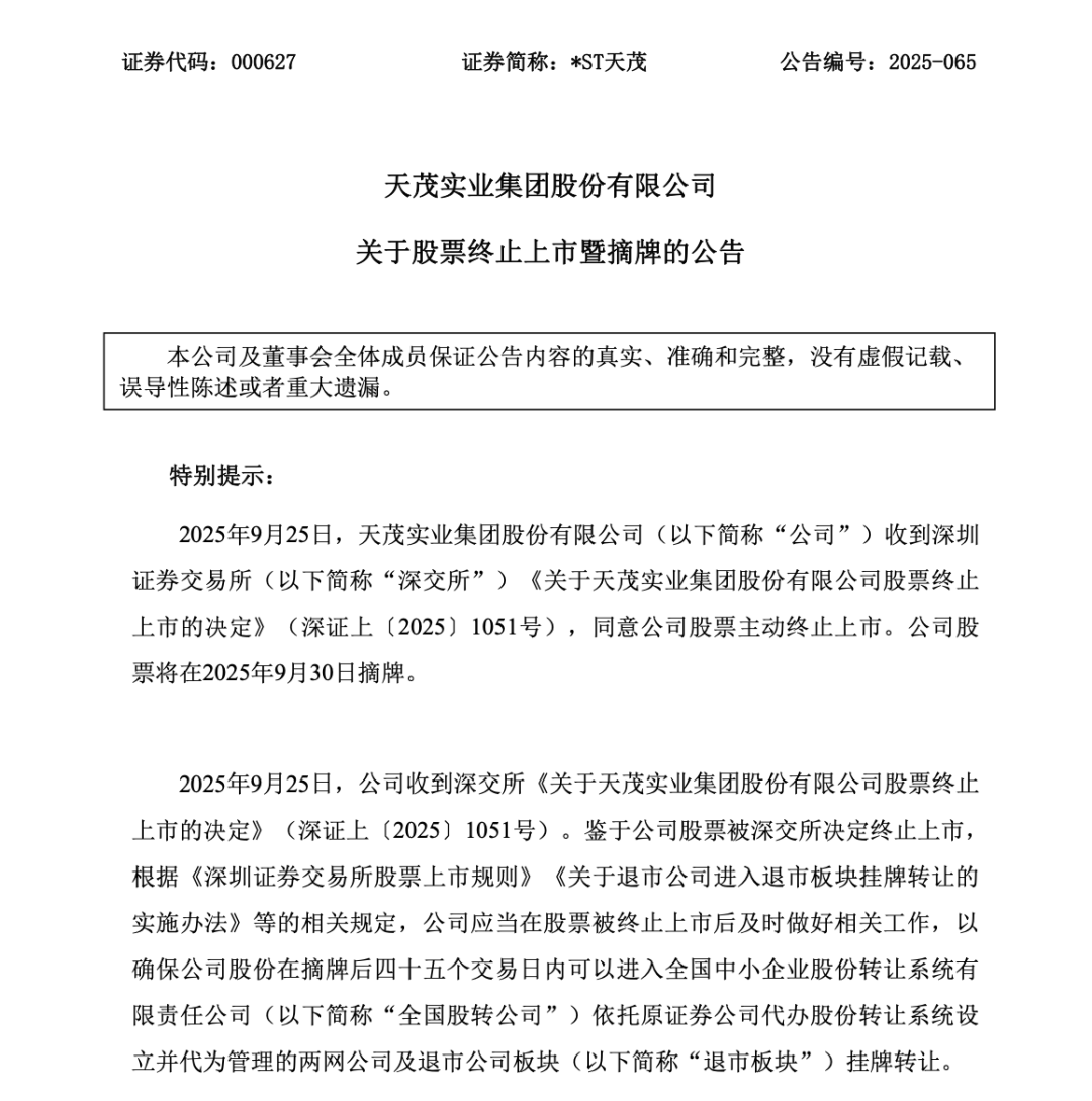 *ST天茂(000627)于9月28日發(fā)布公告,9月25日公司收到深交所《關于天茂實業(yè)集團股份有限公司股票終止上市的決定》,同意公司股票主動終止上市。公司股票將于2025年9月30日摘牌。