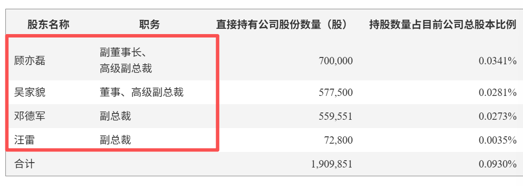 據(jù)最新公告,本次提前終止股份減持計劃的原因是“避免短線交易”。這四位高管職位均在副總裁級別以上,分別是副董事長、高級副總裁顧亦磊,董事、高級副總裁吳家貌,副總裁鄧德軍以及副總裁汪雷。