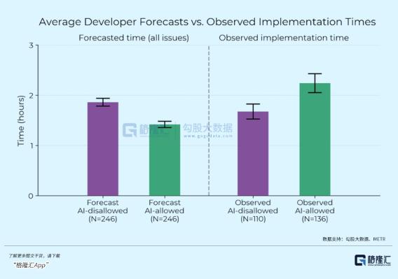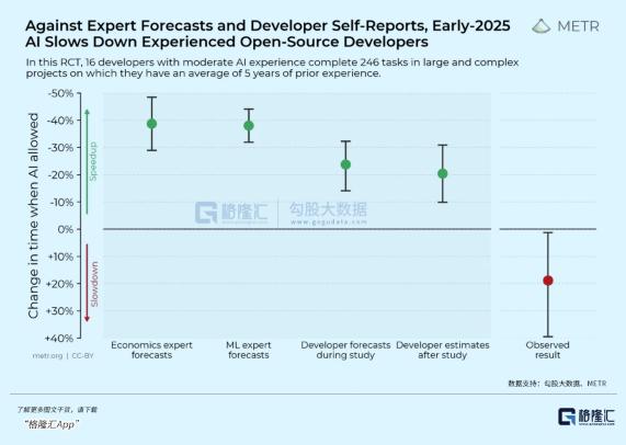 然而回到當下,METR做了一項試驗:將一批經(jīng)驗豐富的軟件工程師分成兩組,一組純?nèi)斯?,另一組使用AI工具編程。結(jié)果卻出人意料,相比于純?nèi)斯ぃ柚鶤I工具預(yù)測快40%,實際上卻慢了19%。也就是說,AI不僅沒提升效率,反而降低了效率。
