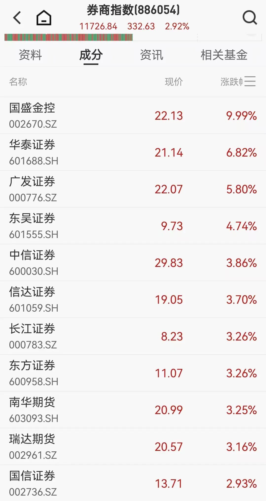 臨近午盤(pán),“牛市旗手”突然加速上攻,國(guó)盛金控漲停,華泰證券漲近7%,東吳證券、中信證券、信達(dá)證券漲超3%。