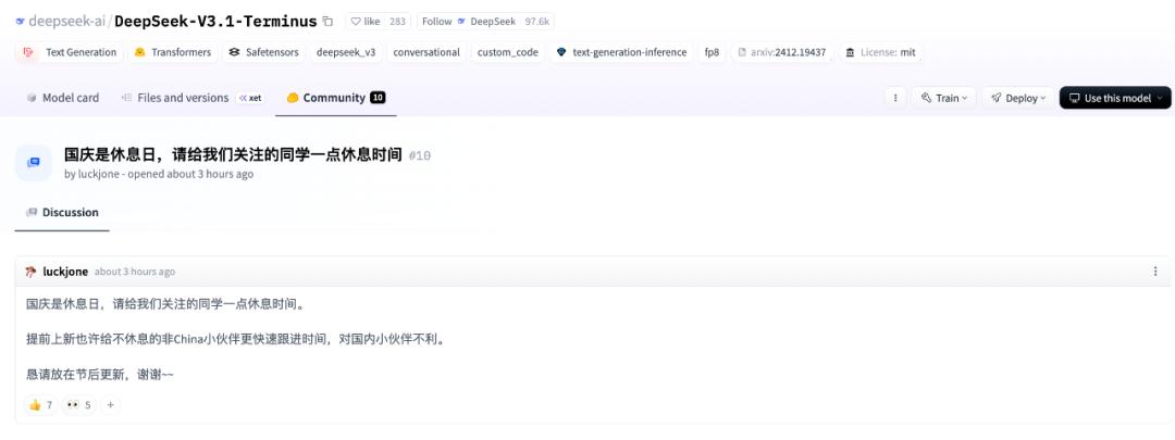 最后,有一波小節(jié)奏。在模型發(fā)布前,已經(jīng)有網(wǎng)友在Community里發(fā)帖稱(chēng):國(guó)慶是休息日,請(qǐng)給我們關(guān)注的同學(xué)一點(diǎn)休息時(shí)間。