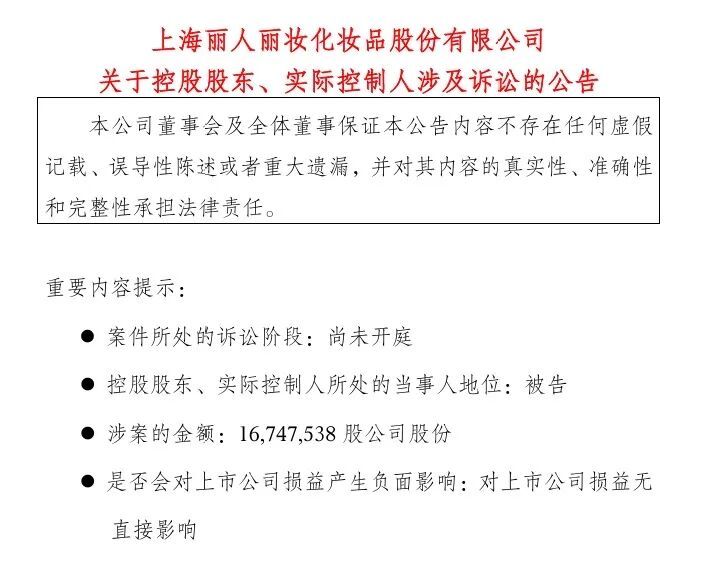 9月29日,麗人麗妝發(fā)布公告,控股股東、實際控制人黃韜因離婚后的財產(chǎn)糾紛,收到上海市徐匯區(qū)人民法院的舉證及應訴通知書,成為被告。