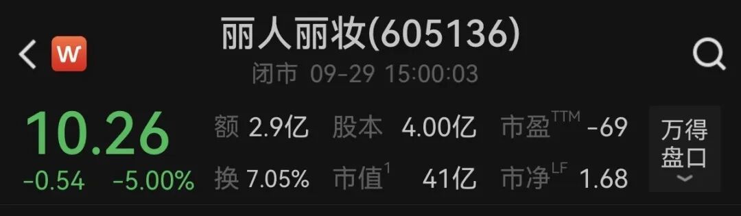 截至9月29日收盤,麗人麗妝跌5%,報10.26元/股,總市值41億元。