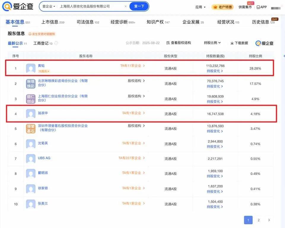 此前,8月22日,麗人麗妝曾公告,因離婚財產(chǎn)糾紛,1674.7538萬股無限售流通股已完成過戶。過戶后,黃韜持股從32.46%降至28.28%,前妻翁淑華持股4.18%。按8月21日收盤價算,翁淑華獲股權市值約1.7億元。
