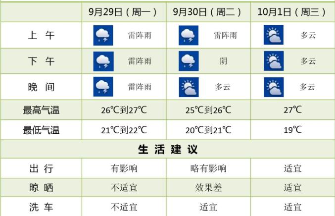 今明兩天,白天全市有小雨到中雨。國(guó)慶中秋假日期間,全市有兩次降水天氣過(guò)程,分別在10月2日 - 3日以及6日。受冷空氣影響,6日 - 7日全市最低氣溫下降6~8℃,并伴有陸上5~7級(jí)、水面6~8級(jí)的偏北大風(fēng)。