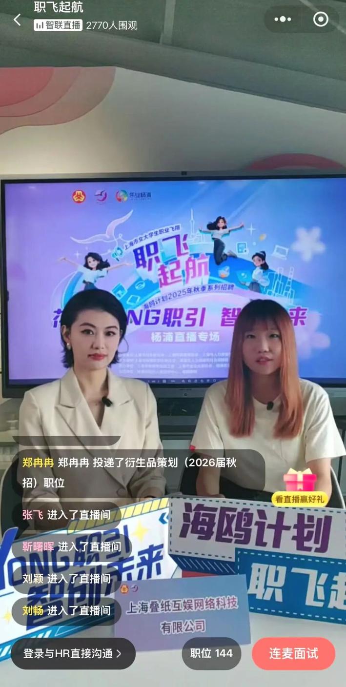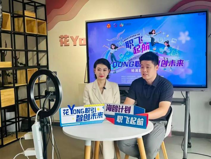 當前就業(yè)市場存在難題,企業(yè)感慨“好苗子難尋”,畢業(yè)生抱怨“專業(yè)不對口、信息不透明”。為打破這一困境,楊浦采用年輕人熟悉的直播方式,搭建高效“數(shù)字云梯”。