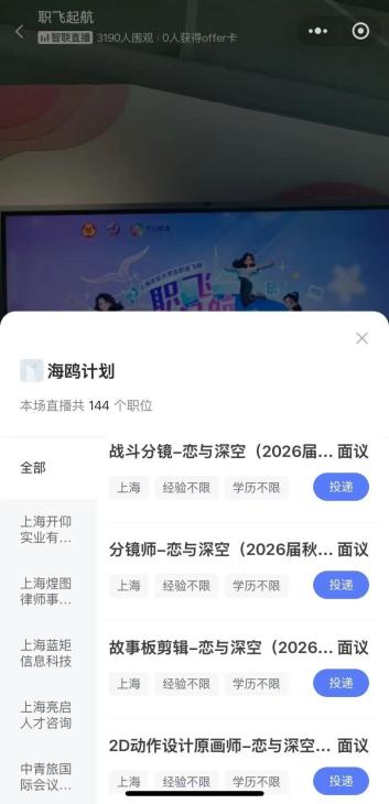 與傳統(tǒng)線下招聘會“廣撒網(wǎng)”不同,數(shù)字化直播招聘效率高、覆蓋面廣。公益項目“海鷗計劃”策劃人、上海市女企協(xié)副會長蔡婷指出,直播能一次性將楊浦優(yōu)質(zhì)企業(yè)資源推送到全市高校,打破地域限制。