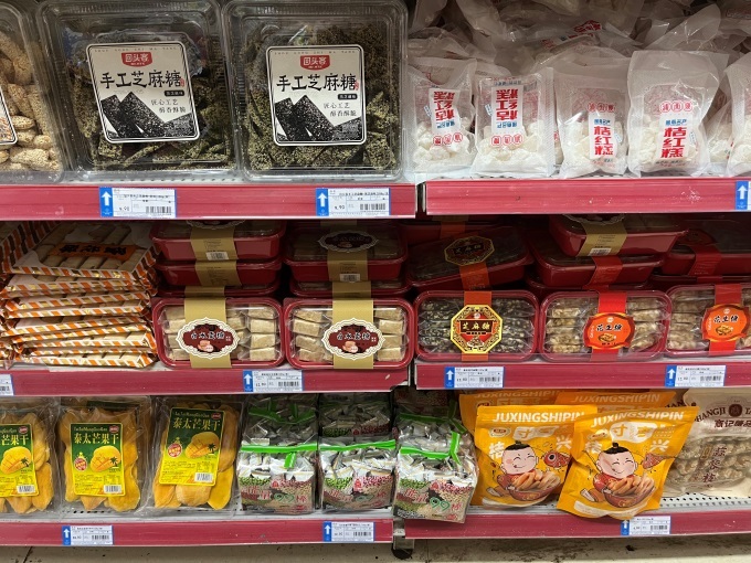 永相逢超市最有特色的是“閩南特產(chǎn)專區(qū)”,貨架上整齊擺放著麗麗薯片、桔紅糕、惠爾康仙草凍、蘆柑茶、古龍香菇肉醬、古龍丁香魚(yú)等幾十種本地人從小吃到大的特色商品。