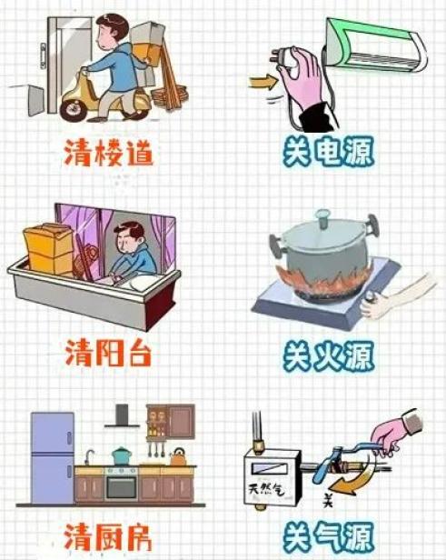居家或外出前要做到“三清三關(guān)”:及時清理陽臺、廚房、樓道的可燃物,不堆放雜物;外出或就寢時,要關(guān)火、關(guān)電、關(guān)氣。教育孩子不玩火。
